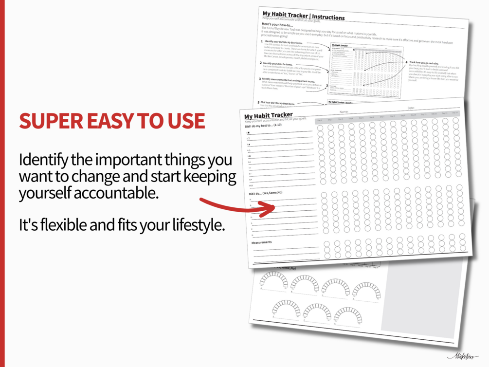 Stay focussed on what matters in your life! The My Habit Tracker tool was designed to be super simple so you use it everyday, but it's based on focus and productivity research to make sure it's effective and gets even the most hardcore procrastinators going!