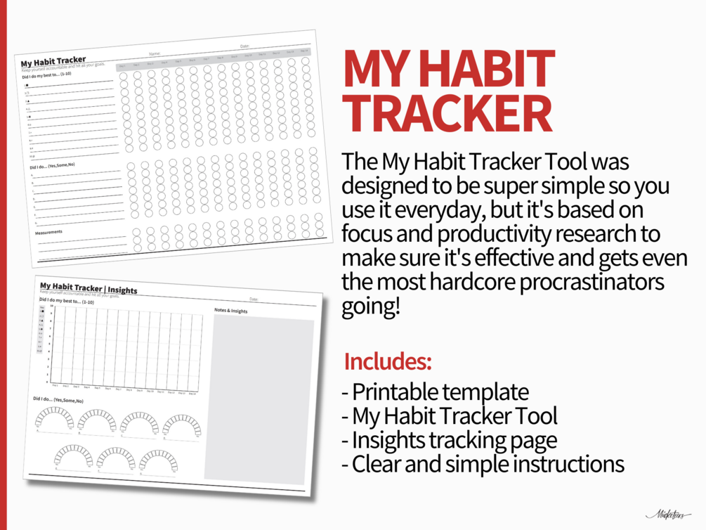 Do you need help to stay focussed on what matters in your life? We got you. That's exactly why we created the My Habit Tracker tool! We designed it to be super simple so you use it everyday, but it's based on focus and productivity research to make sure it's effective and gets even the most hardcore procrastinators going!